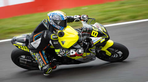 Cadwell Park, holding area. Nerves are buzzing, and to add to the fun, it’s raining. I’m on a Triumph Daytona 660, prepped to perfection by Macadam Triumph Racing. We've got full Metzeler wets and softened Bitubo suspension for better feel, plus a gentler throttle map and less engine braking. This bike started as a stock road machine, but with race parts and on-the-fly adjustable engine and throttle maps, it’s all race-ready now.